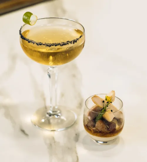 Food presentation: In a verrine dish, put one tablespoon of chestnut cream then add a tablespoon of nuts mix. On top, add one tablespoon of marinated chicken.