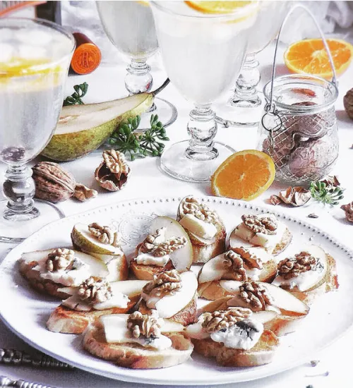 So fast and easy to prepare and so good! This crostini recipe with blue cheese and pear with a touch of Cointreau will delight all your guests without exception.