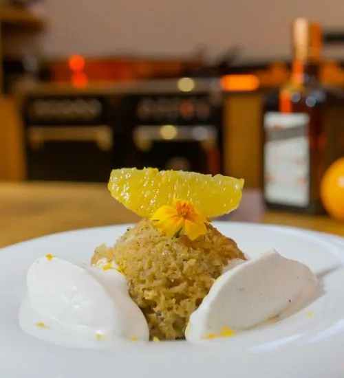 Whip the cream, then add the vanilla, sugar and Cointreau l'Unique.