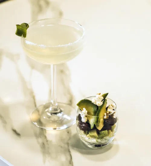 Food presentation: In a small verrine dish, put two tablespoon of ceviche then one teaspoon of the jelly, add salted pop-corns on the top.