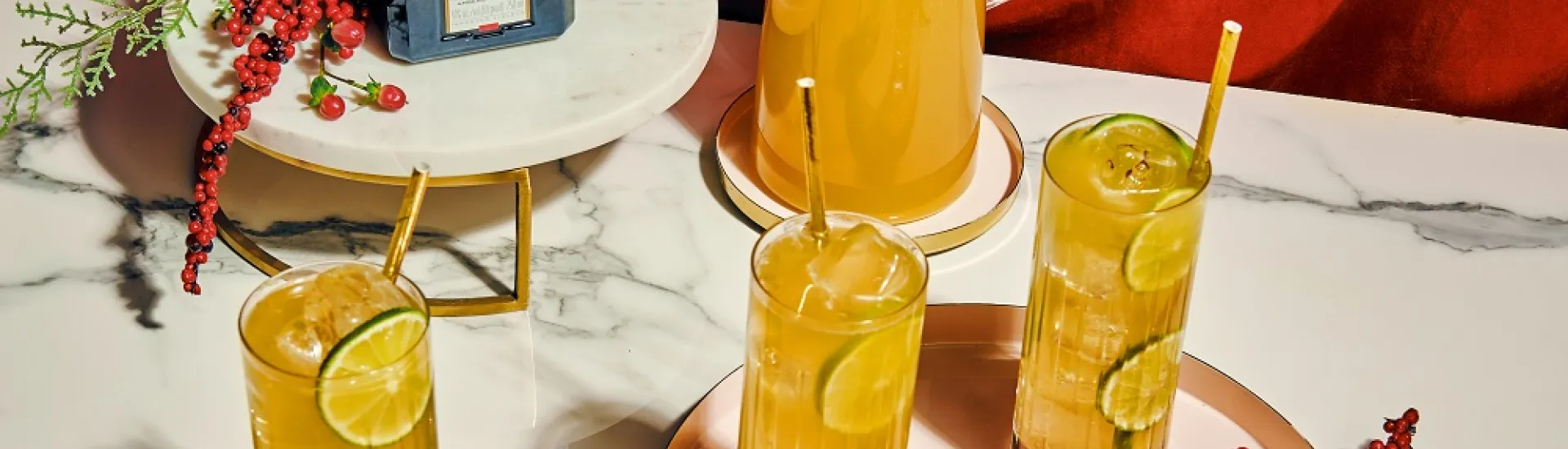 Pour into collins glasses over ice and garnish each glass with lime wheels.