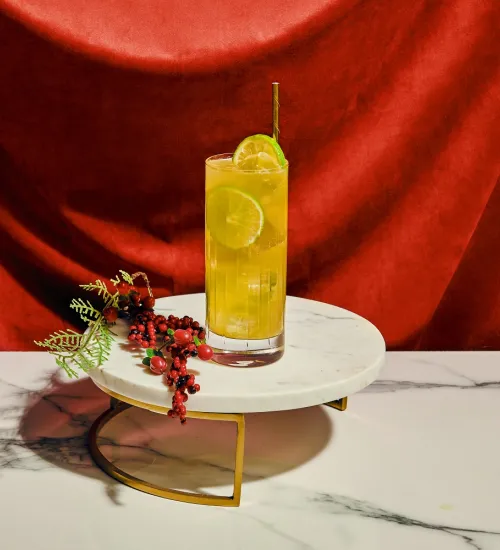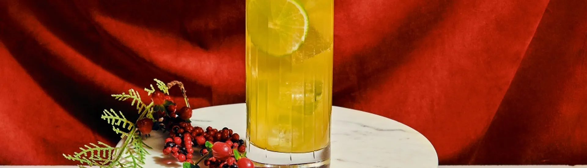 Fine strain into collins glass over ice. Finish with soda and garnish with lime wheels.