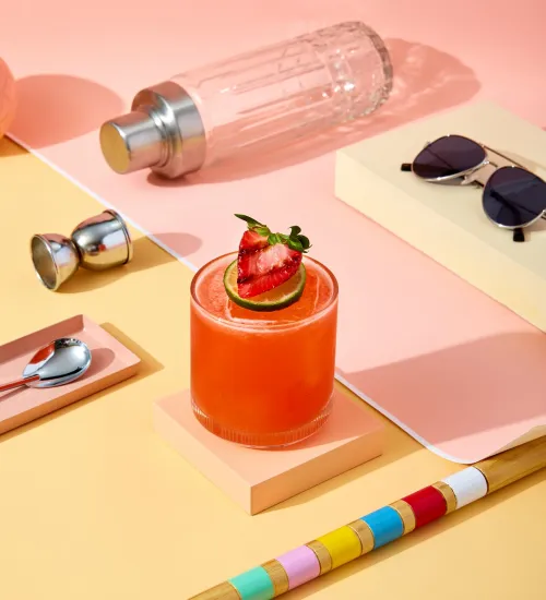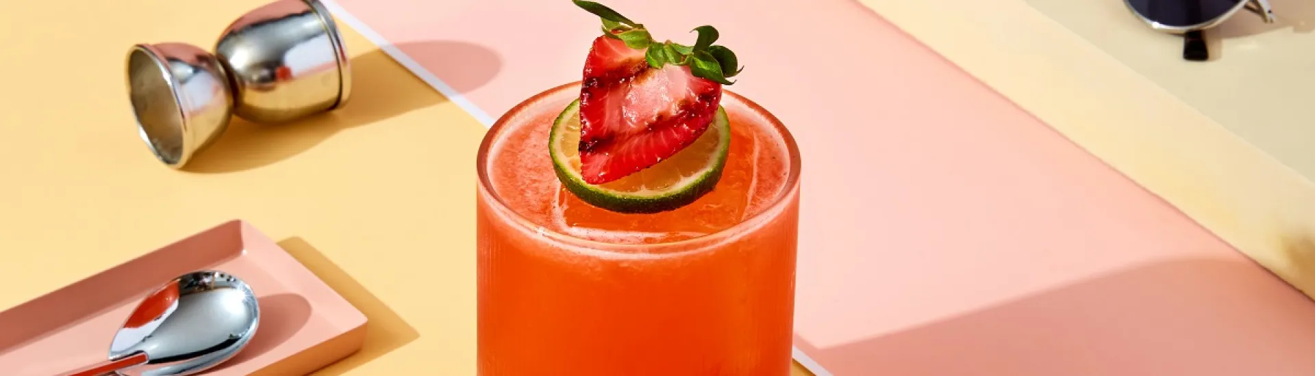 Garnish with lime and roasted strawberry.