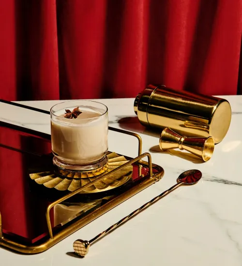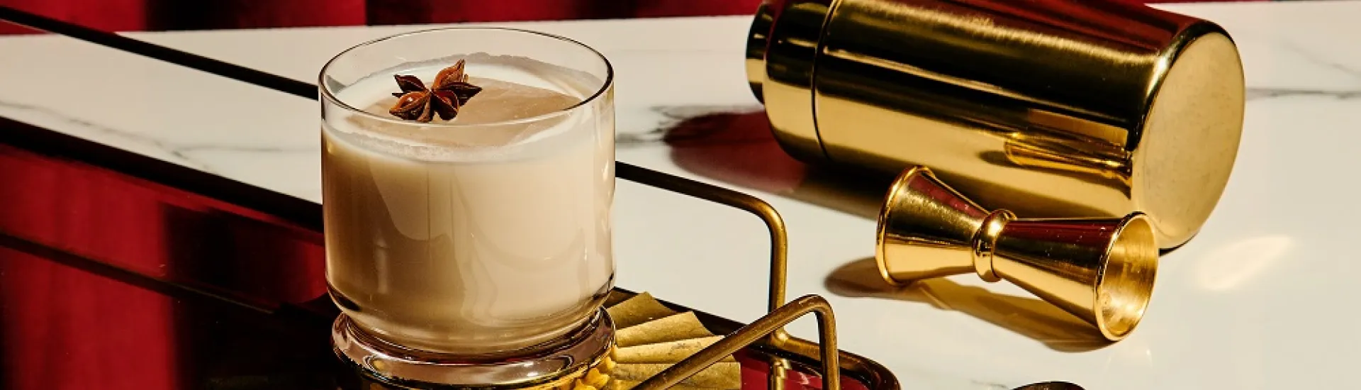 Fine strain into rocks glass with a big cube. Garnish with star anise.